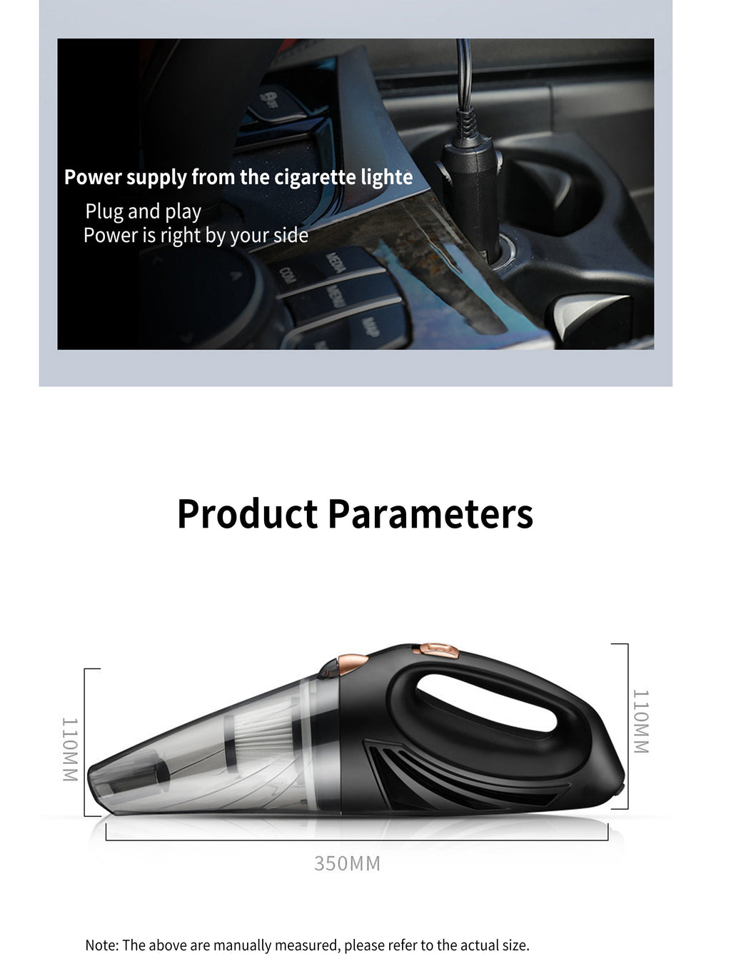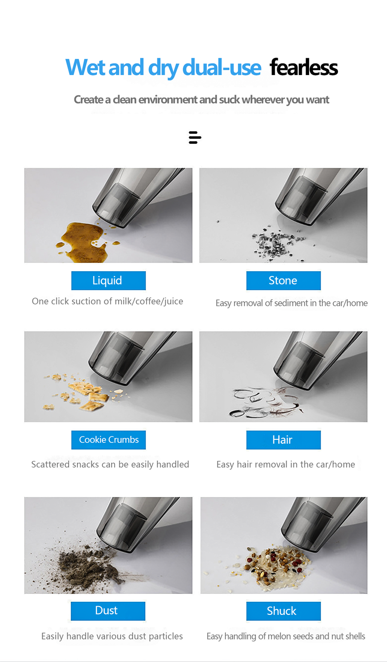 Strong suction:The vacuum cleaner has a power of 90W and the high performance motor reaching 3000rpm and nearly 4.5kPa vacuum suction.It can be deeply cleaned to remove all dust and debris inside the car, creating a clean interior environment.