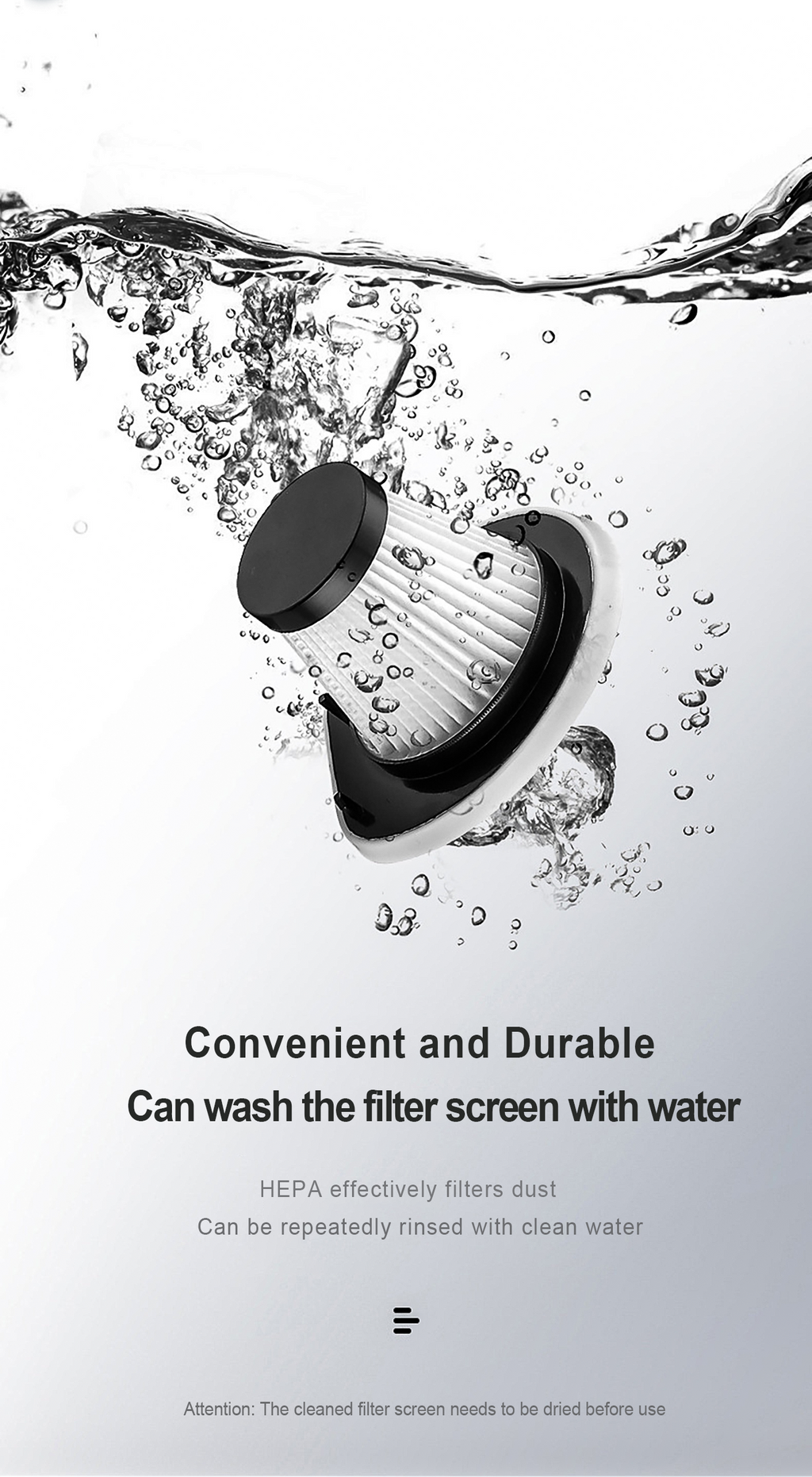 Convenient and durable: The washable filter screen can be reused repeatedly. A 9m operating diameter can cope with the complex environment inside the car and improve efficiency.