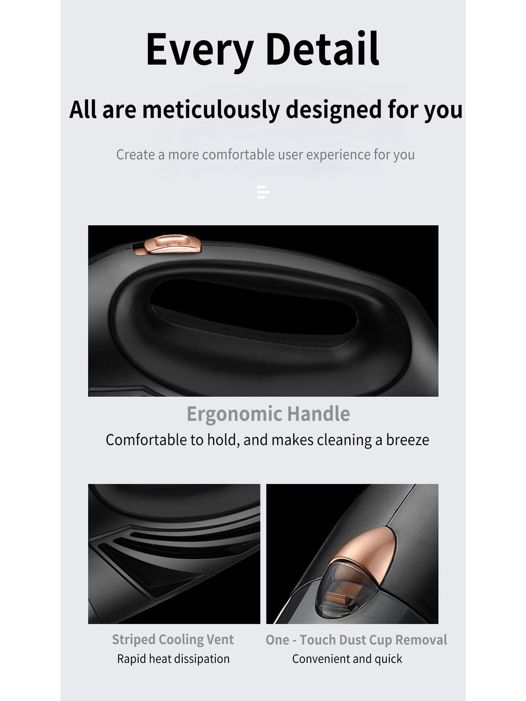 Comfortable user experience: The ergonomic handle and dust cup can be easily disassembled,it can make you clean easier.